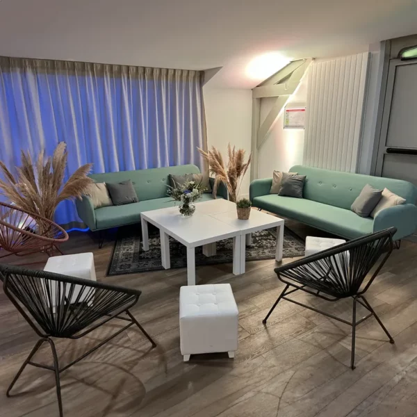 Disponible à la location en Normandie et à Paris. Notre équipe vous accompagne dans la composition de votre coin lounge avec mobilier, éclairage et accessoires adaptés à votre ambiance.